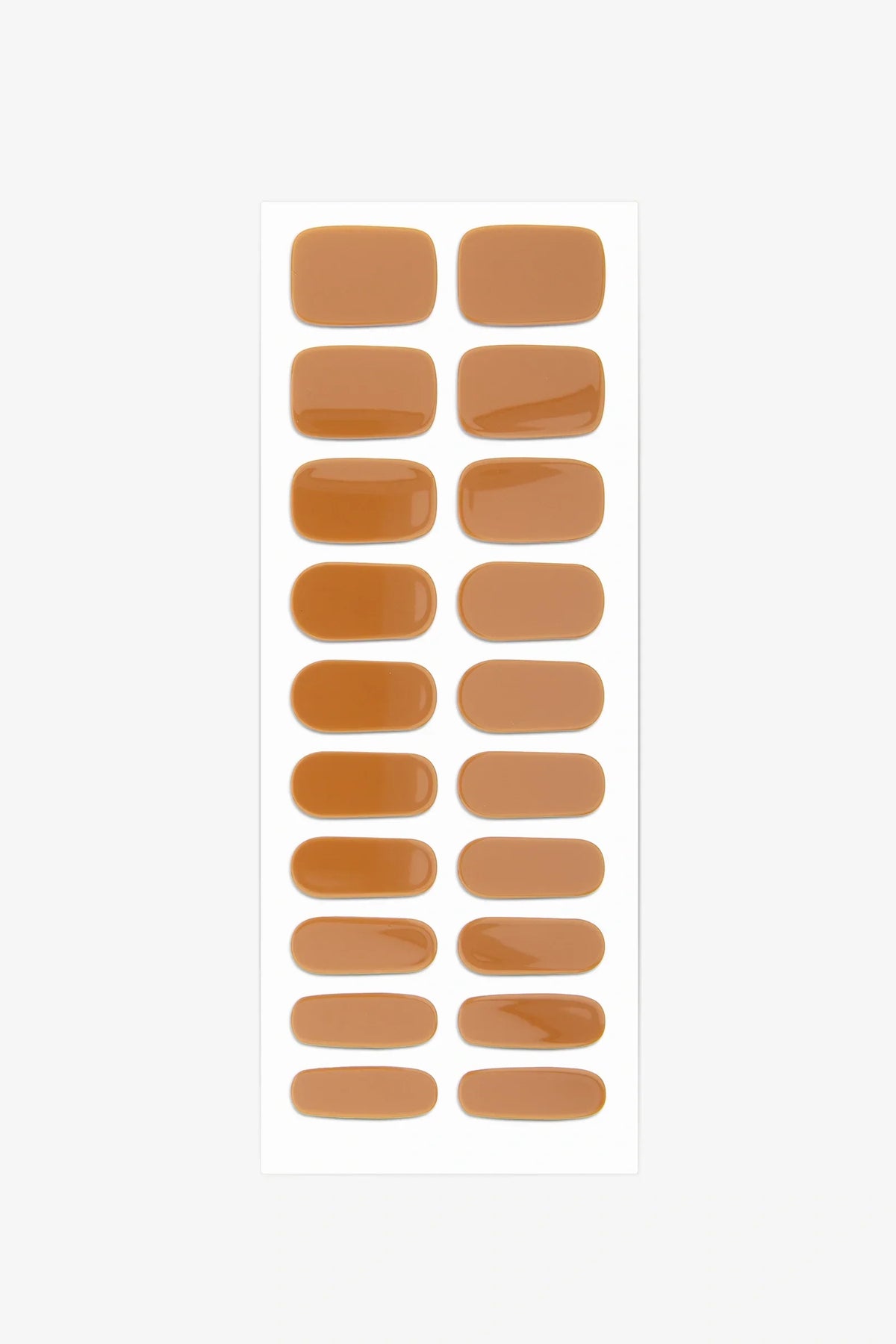 Full sheet of Burnt Caramel semi-cured gel nail stickers displaying various sizes on a white background.