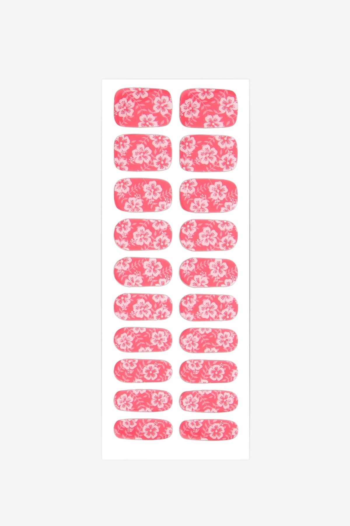 Vibrant pink gel nail wraps decorated with white hibiscus blooms.