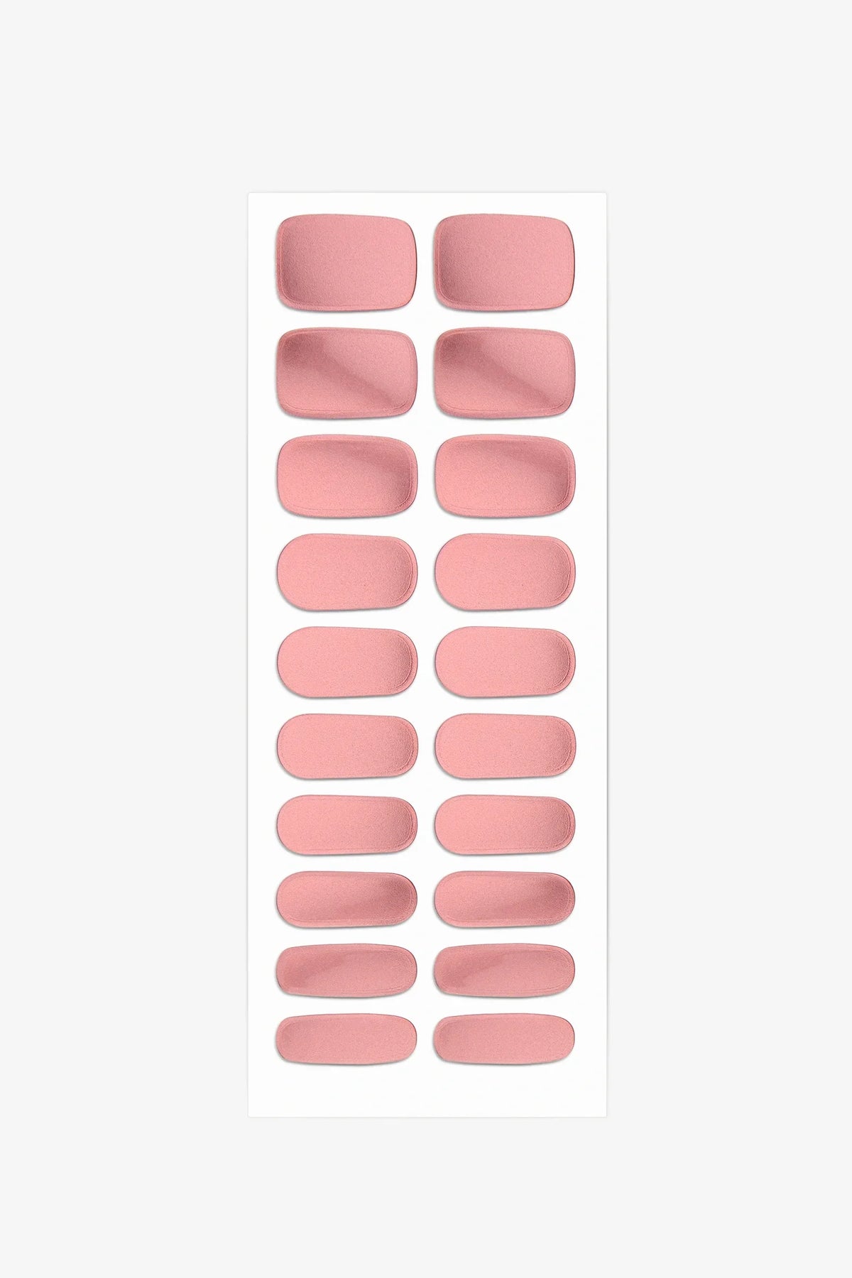 Metallic rose-pink semi-cured gel nail wraps with a soft pearlescent sheen and a slightly translucent edge that shifts depending on the light.
