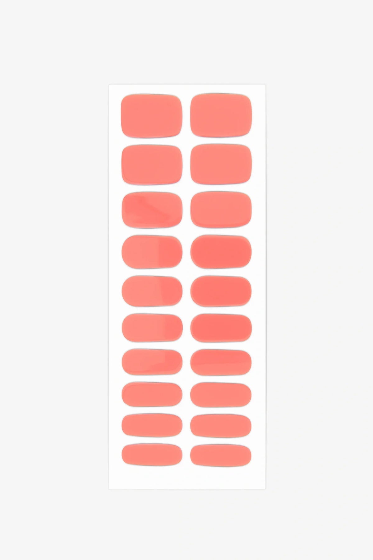 Bright coral-pink gel nail wraps with a punchy pink-red hue and a vibrant, glossy finish.