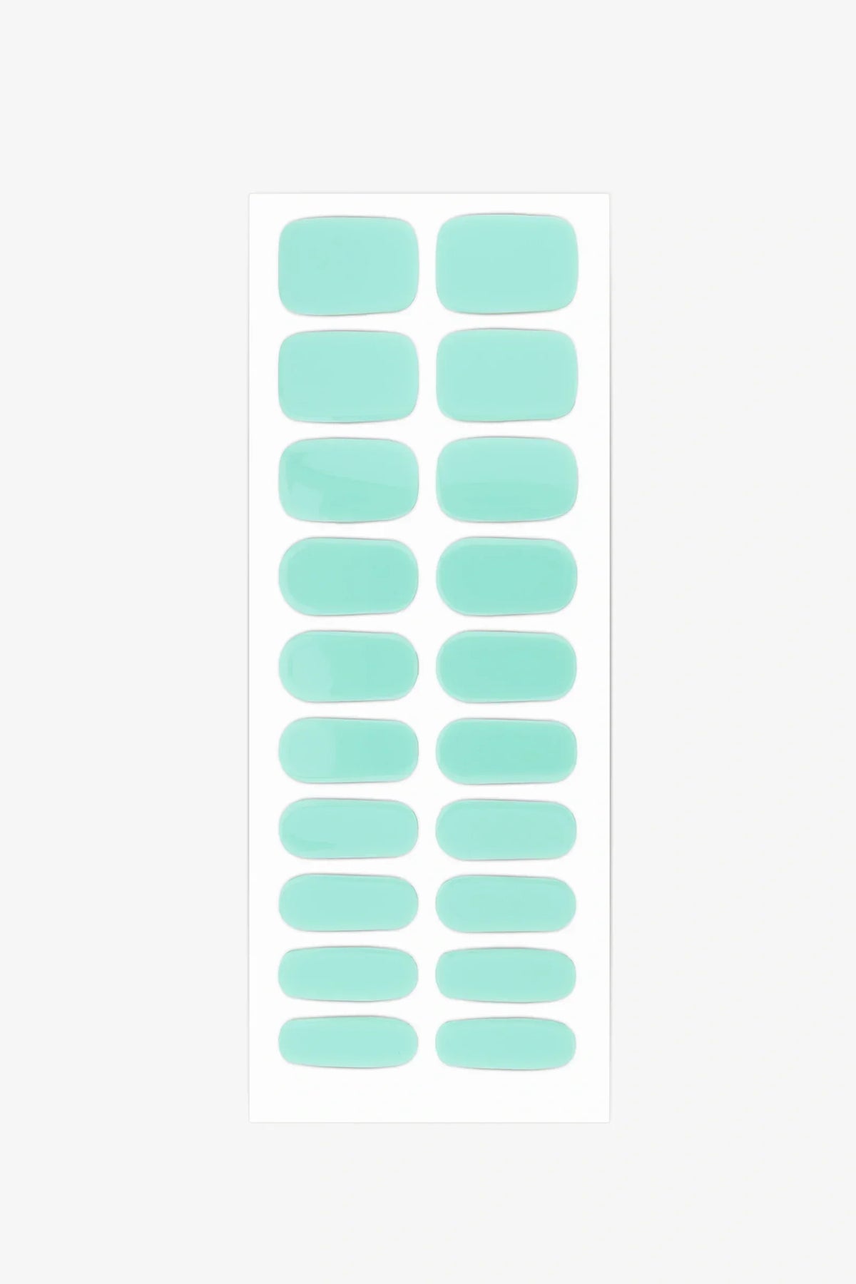 Semi-cured gel nail wraps in light turquoise aqua with a crisp, high-gloss finish, shown on medium skin tone with neatly rounded nails.