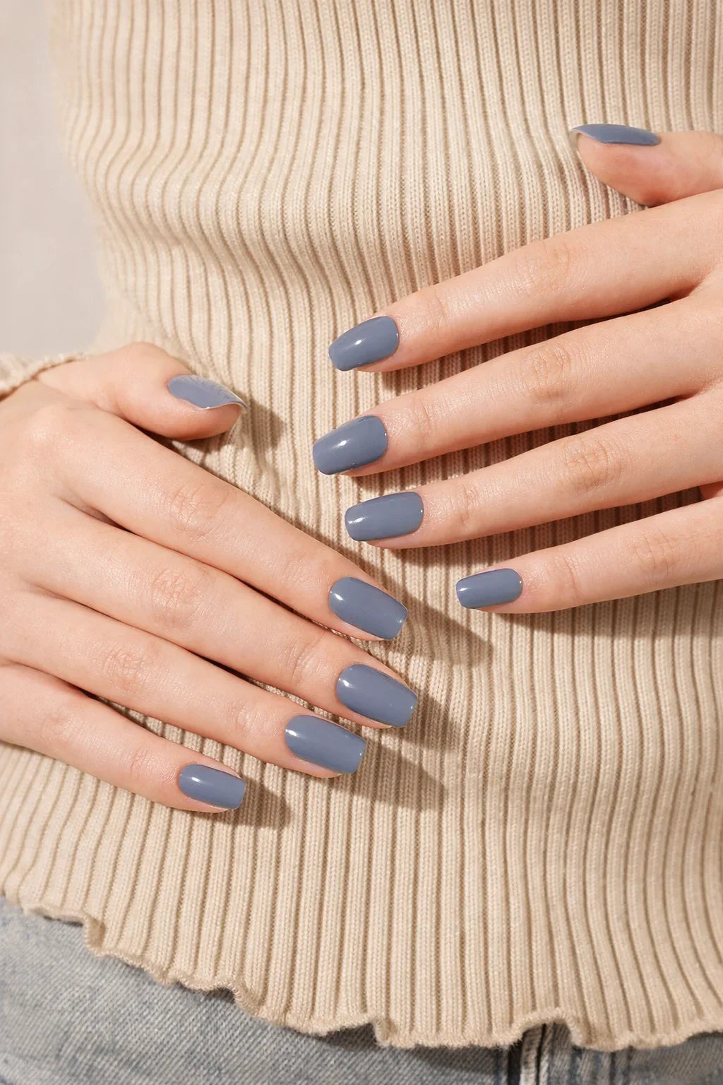 Cool slate-blue semi-cured gel nail wraps with a smooth, glossy finish and a soft grey-blue undertone.