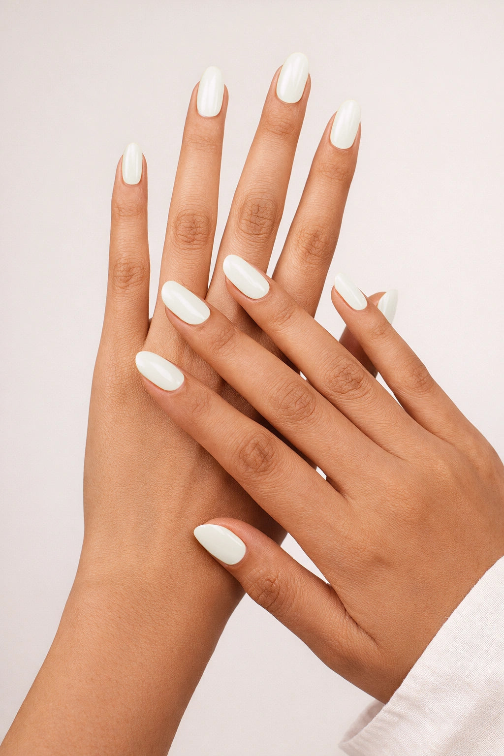 Dairy Queen semi-cured gel nail stickers with a soft milk-white, opaque high-gloss finish on medium-tan skin, photographed under soft studio lighting with a clean white long-sleeve outfit.