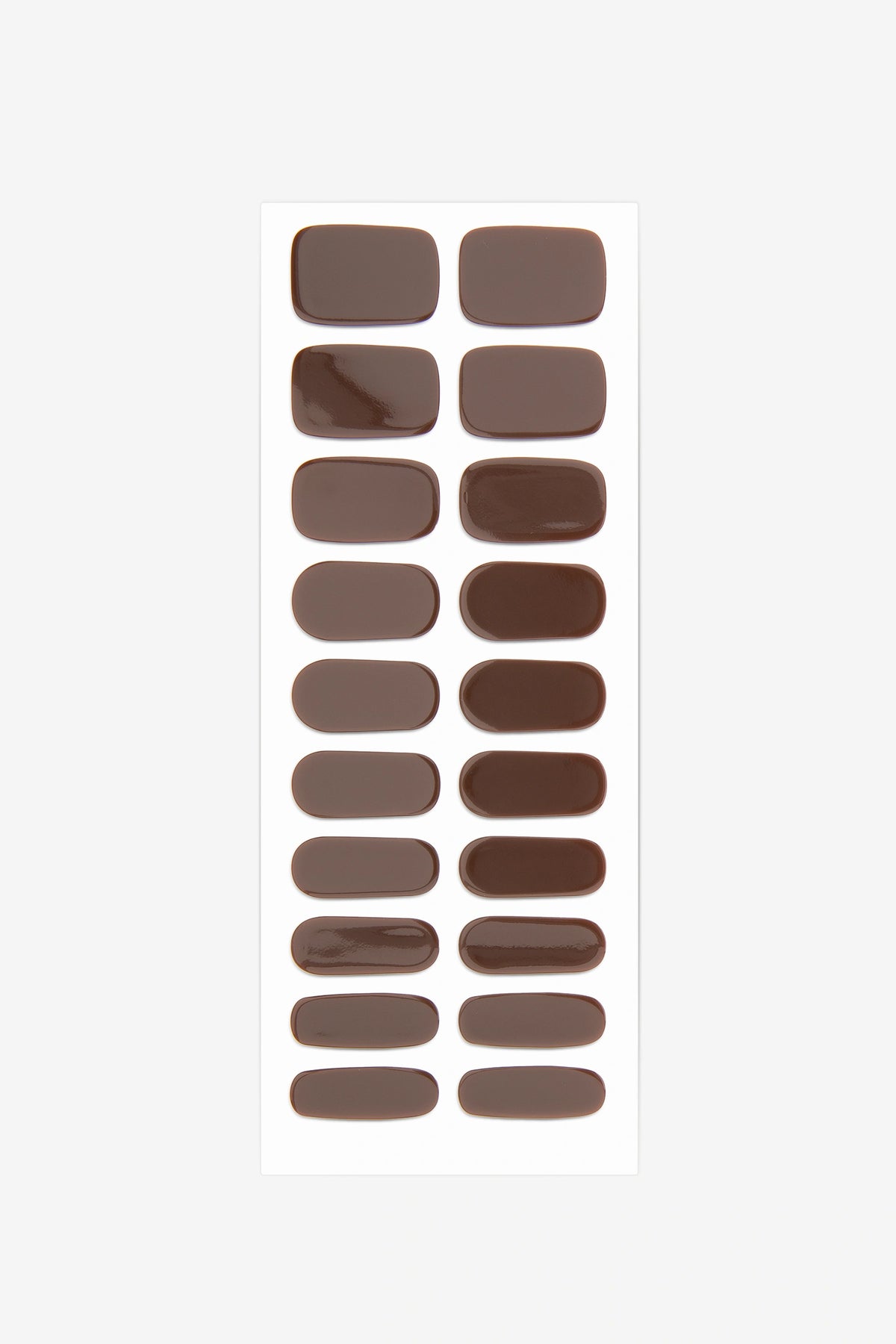 Full sheet of Espresso Roast semi-cured gel nail stickers displaying various sizes on a white background.