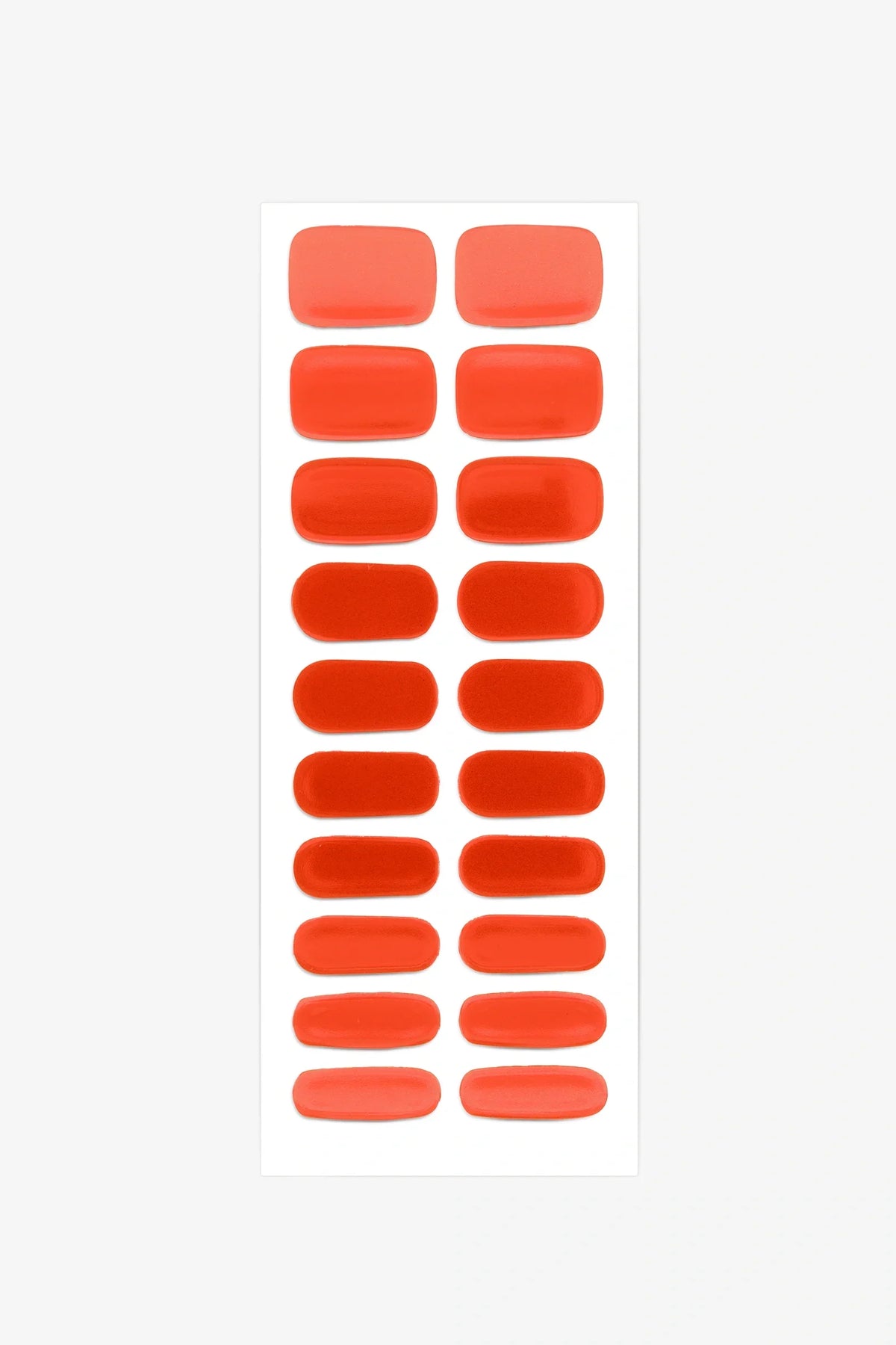 Bold red semi-cured gel nail stickers with a sheer finish. The metallic shine adds fire, while the gloss finish brings the final flare to these red-hot wraps.