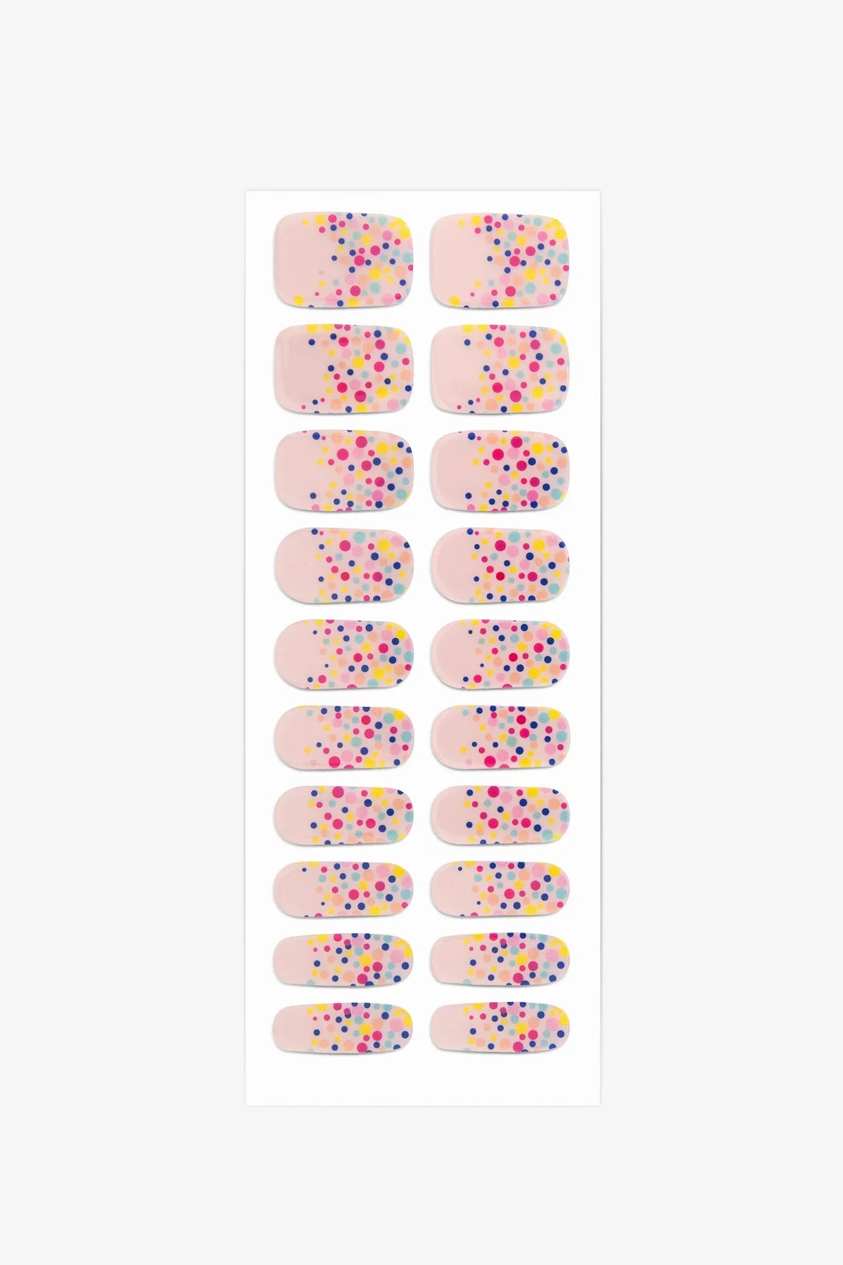 A soft, warm nude base with scattered rainbow polka dots. These playful semi-cured gel wraps have a glossy finish.