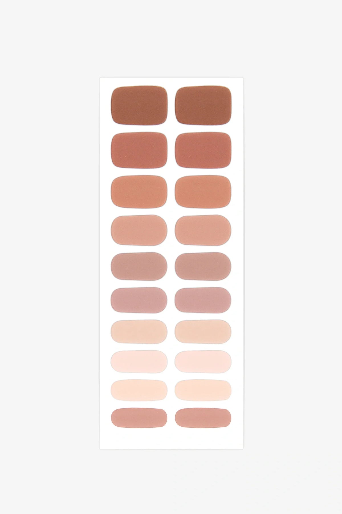 A gradient of warm neutrals ranging from soft cream to sun-baked brown with a matt finish. The muted sandy tones of these semi-cured gel nail strips are perfectly on trend for 2025.