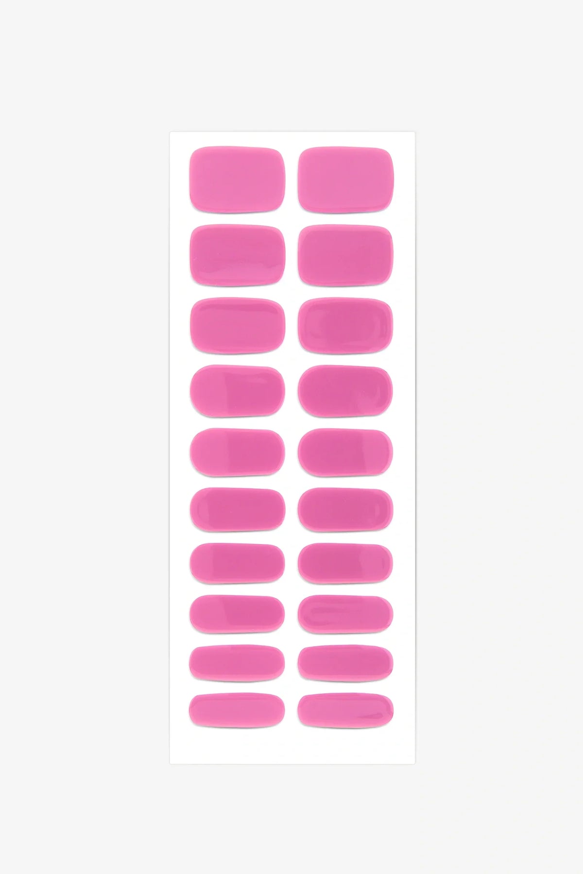 Translucent pink gel nail wraps with a glossy finish and bubblegum tone. The soft, sheer pink glows green in the dark, adding a playful twist to your mani.