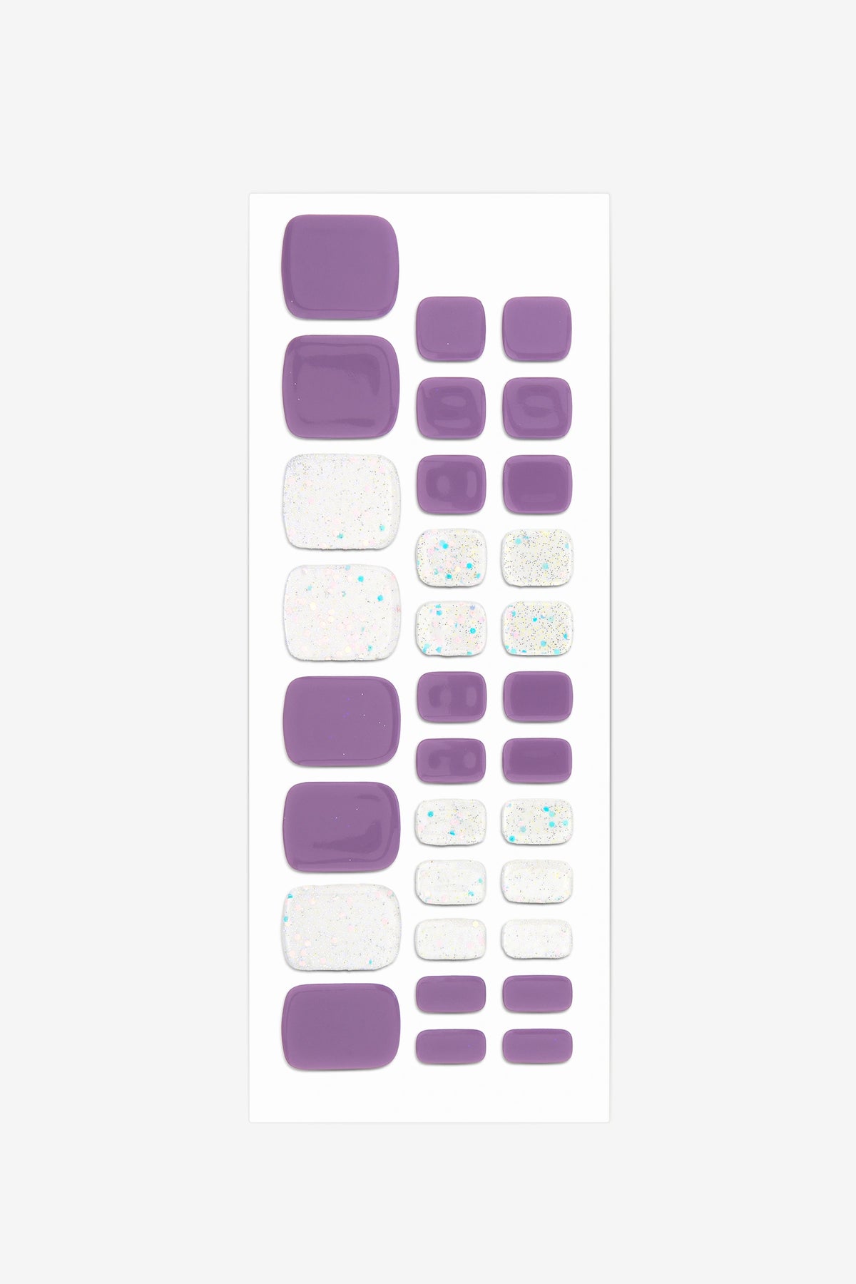 Creamy lilac purple paired with clear wraps scattered in blue and purple holographic sprinkles. These semi-cured gel toenail stickers feature a fine shimmer on the transparent nails, with a high-gloss finish across the full pedi.