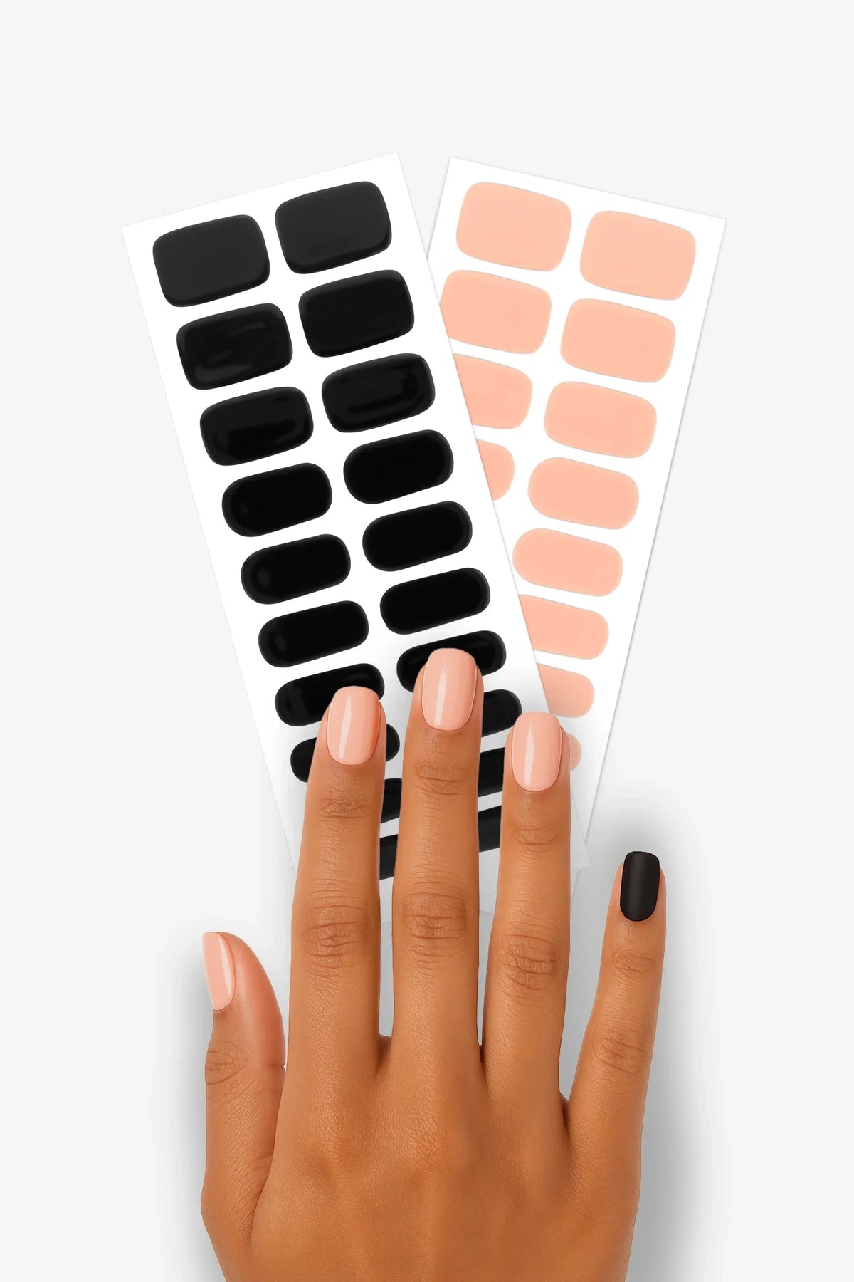 A high-gloss peach contrasted with the muted drama of matt black in this 2-pack semi-cured gel nail wrap bundle.