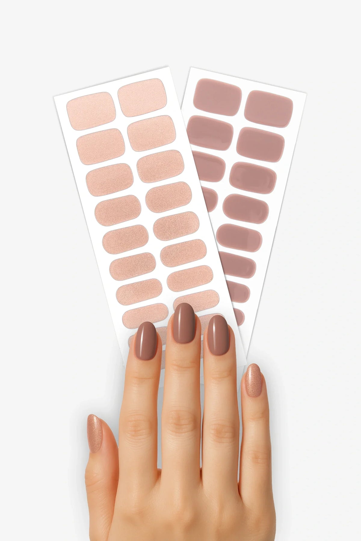 Semi-cured gel nail wraps in earthy taupe accented with another set in soft, rose-gold shimmer. Both manicures set to a sleek, high-gloss finish.