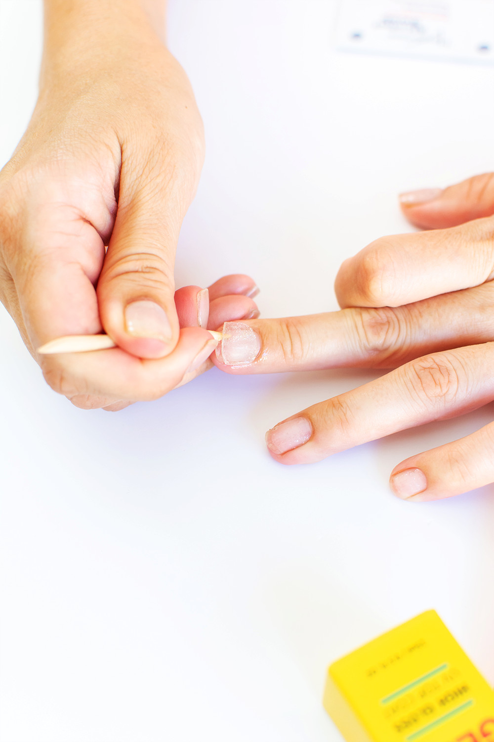 Gently lift the edges of the strip to create small gaps. Use the wooden stick to work in a few drops of cuticle oil (or polish remover).